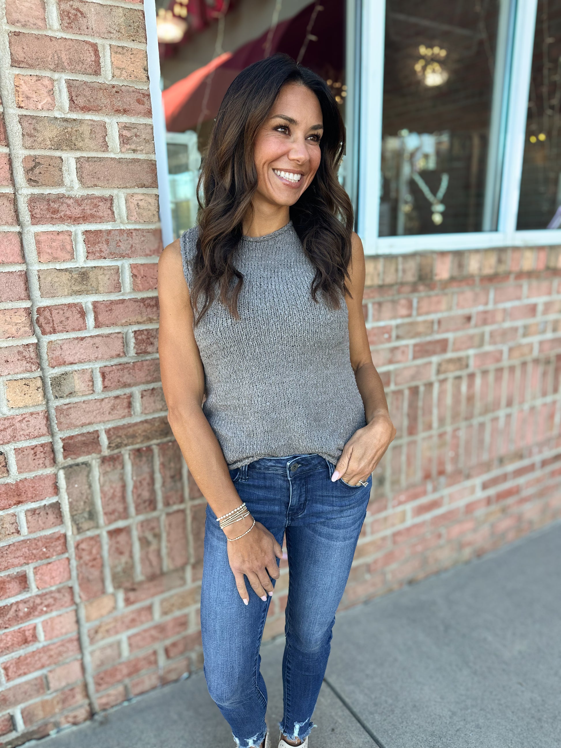 This knit tank offers effortless style and cozy comfort, making it the perfect go-to piece for any wardrobe.