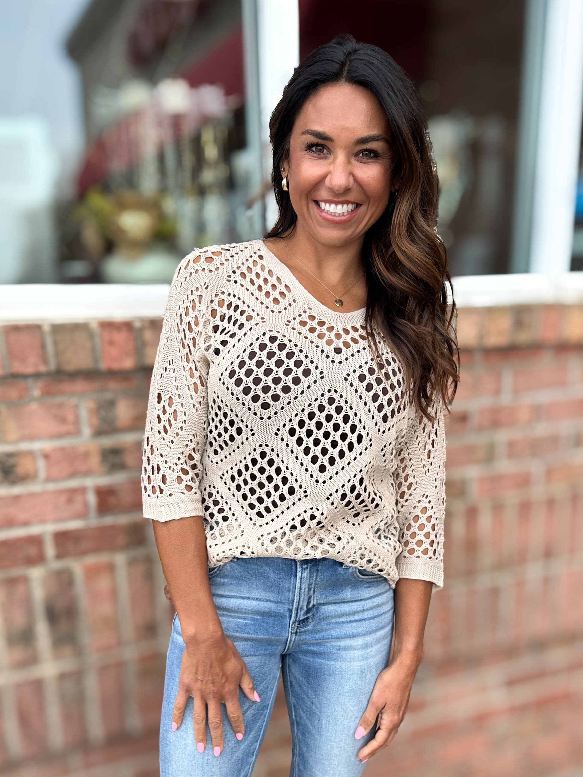 This charming crochet knit top features a flattering scoop neckline and three-quarter length sleeves that strike the perfect balance between cozy and chic. The delicate openwork texture adds visual interest while keeping things breezy and effortless. Perfect for layering or wearing solo, it's your new go-to piece for casual elegance with a touch of whimsy.