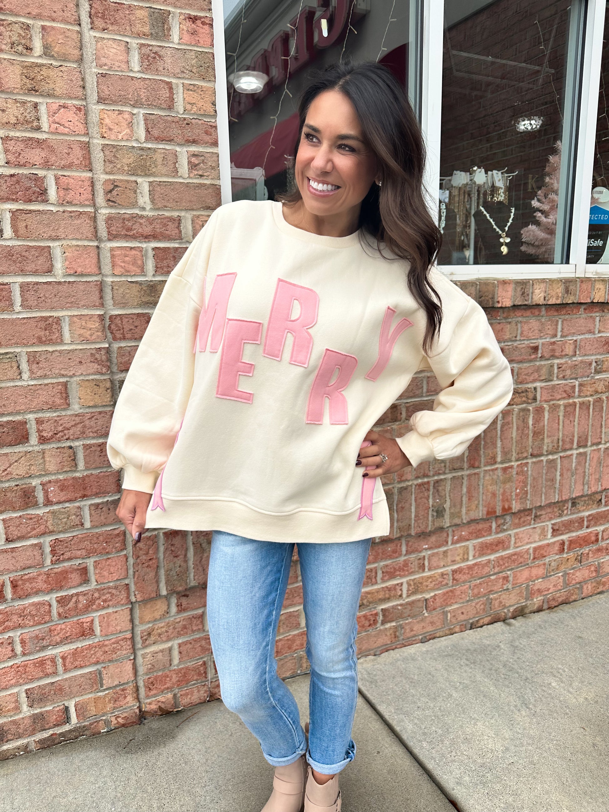 Spread holiday cheer in this delightful fleece sweatshirt featuring adorable side bow patches and festive "merry" lettering. Crafted from cozy fleece, it's the perfect blend of comfort and Christmas spirit. The charming bow details add a whimsical touch that'll have everyone smiling, whether you're sipping cocoa by the fire or heading out for seasonal festivities. Soft, warm, and bursting with holiday personality—your new favorite way to celebrate the season!